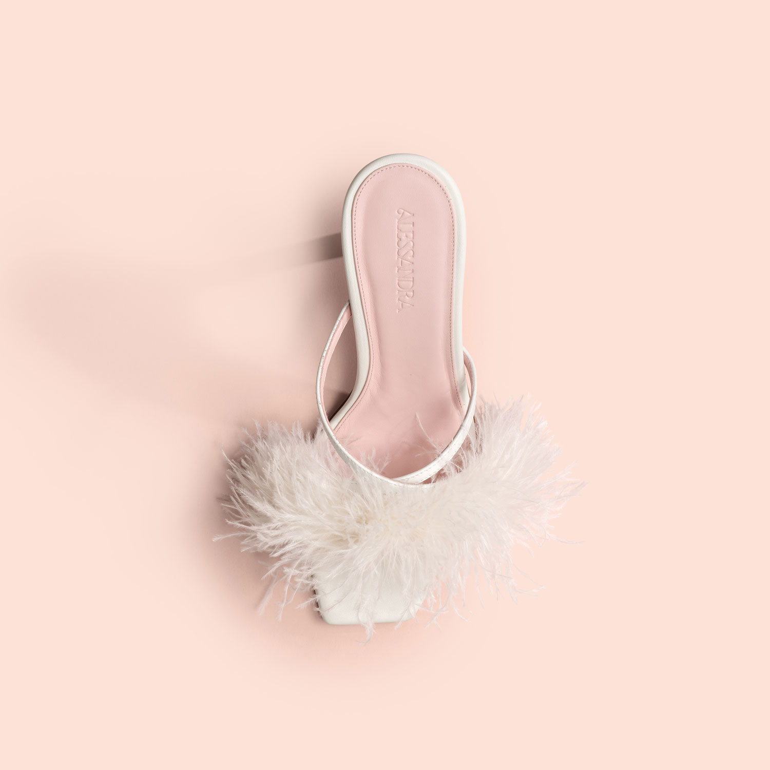 Il sandalo Bellini ha una silhouette lineare, essenziale ed elegante che gli permette di essere indossato in ogni occasione e ad ogni ora, un passe-partout ideale. Prodotto in Italia, interamente a mano, è decorato da cinturini minimalisti che avvolgono delicatamente il piede. Montato sul nostro iconico tacco da 75 mm, il Bellini è realizzato in pelle e piume bianche; la sua suola interna di 6 mm in memory foam regala un comfort assoluto al piede.